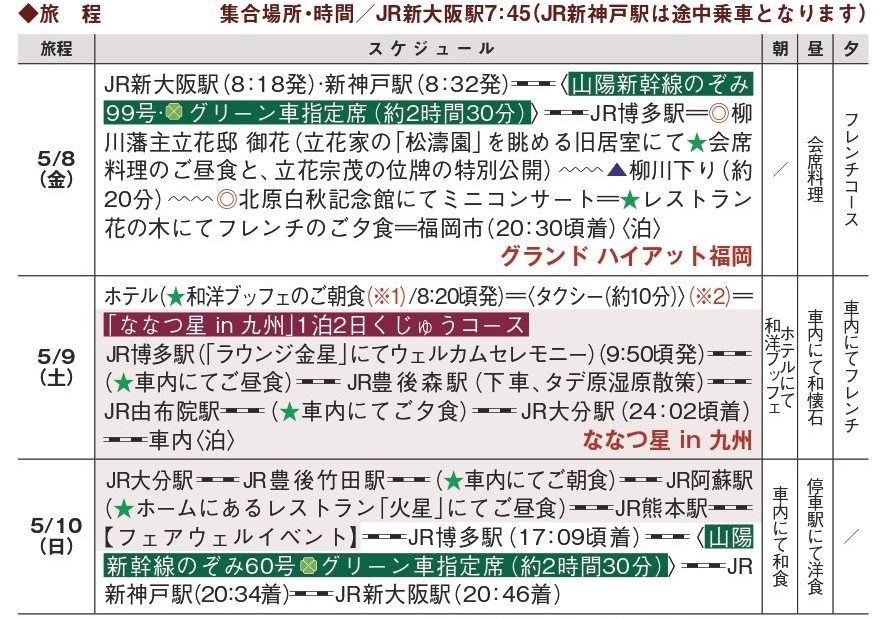 | 宿泊施設 | 1泊目:[福岡市内]グランドハイアット福岡 2泊目:[車内]ななつ星in九州 | ||||||||||||||||