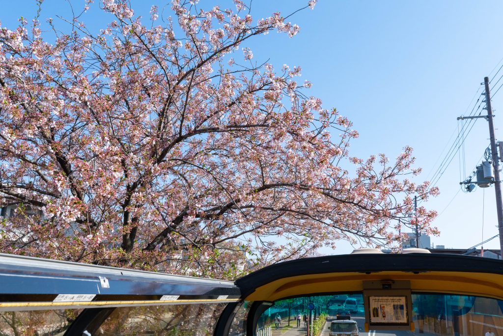 スカイバス2階席から「手に届くような距離」にある桜を車窓からお楽しみください。