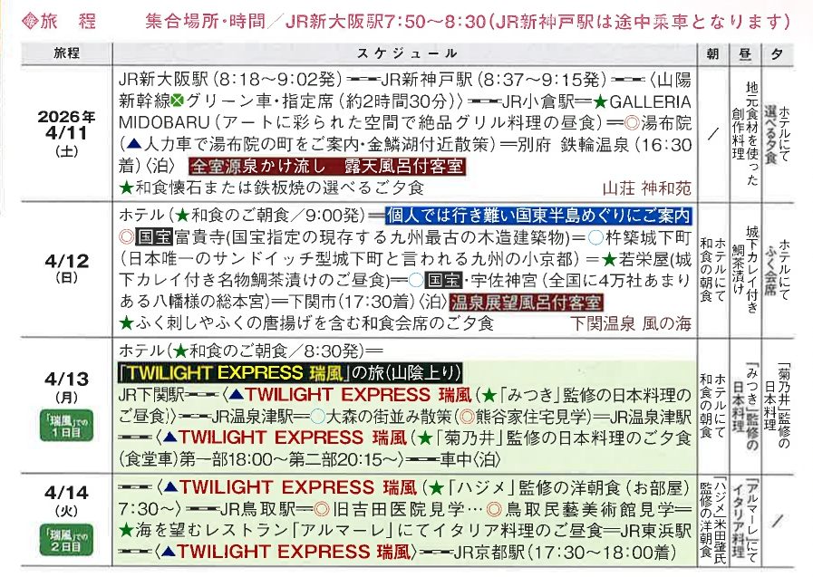 | 宿泊施設 | 1泊目:[別府鉄輪温泉]山荘 神和苑 2泊目:[下関温泉]風の海 3泊目:[車内]TWILIGHT EXPRESS 瑞風 | ||||||||||||
