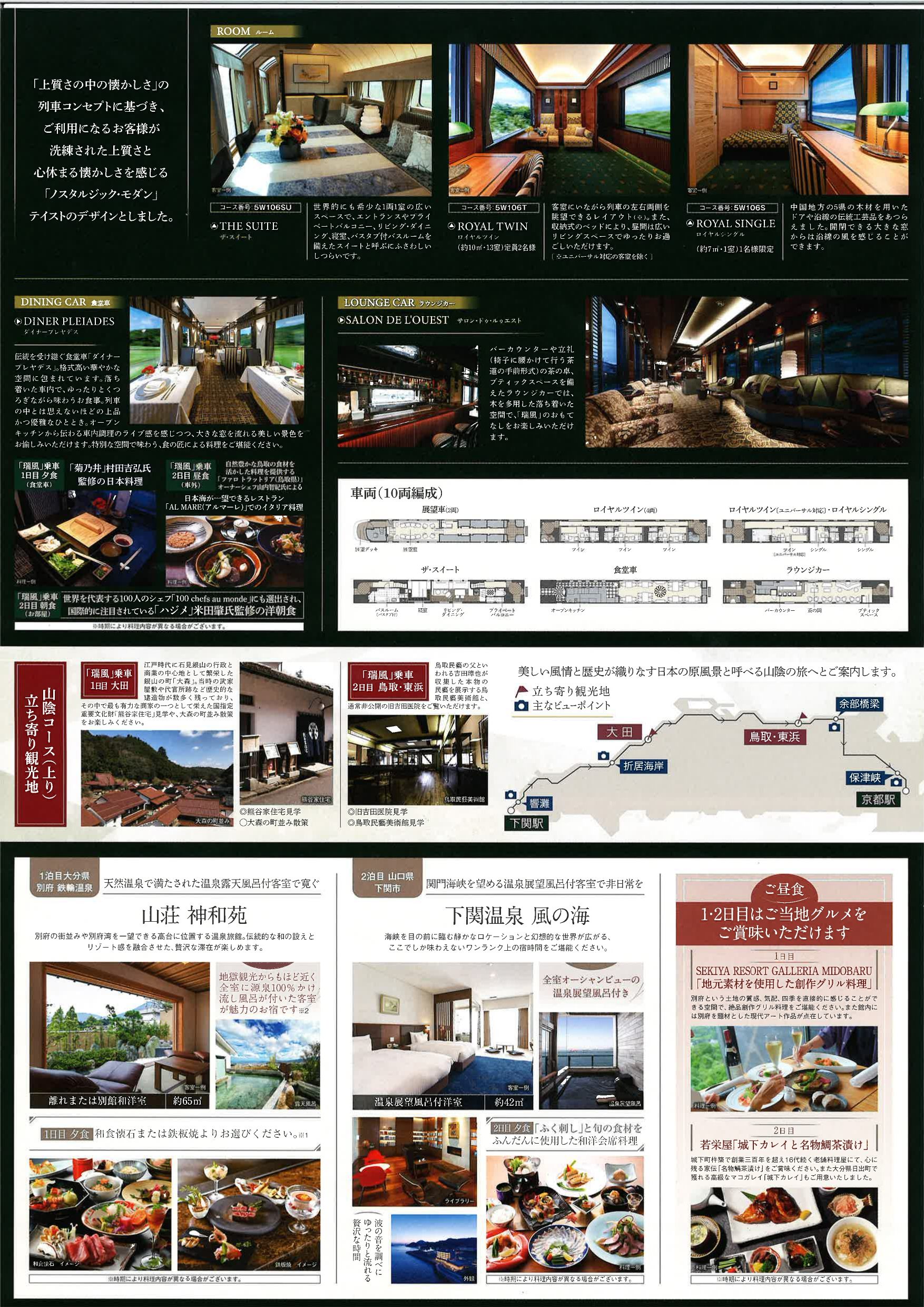 | 宿泊施設 | 1泊目:[別府鉄輪温泉]山荘 神和苑 2泊目:[下関温泉]風の海 3泊目:[車内]TWILIGHT EXPRESS 瑞風 | ||||||||||||