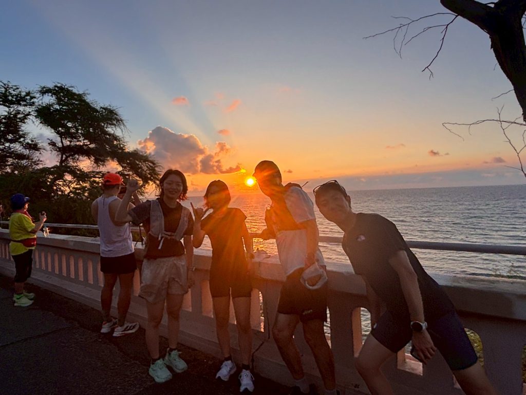 ハワイのきれいな朝焼けを見ながら、翌日の本番に向けて体を動かしていきましょう。