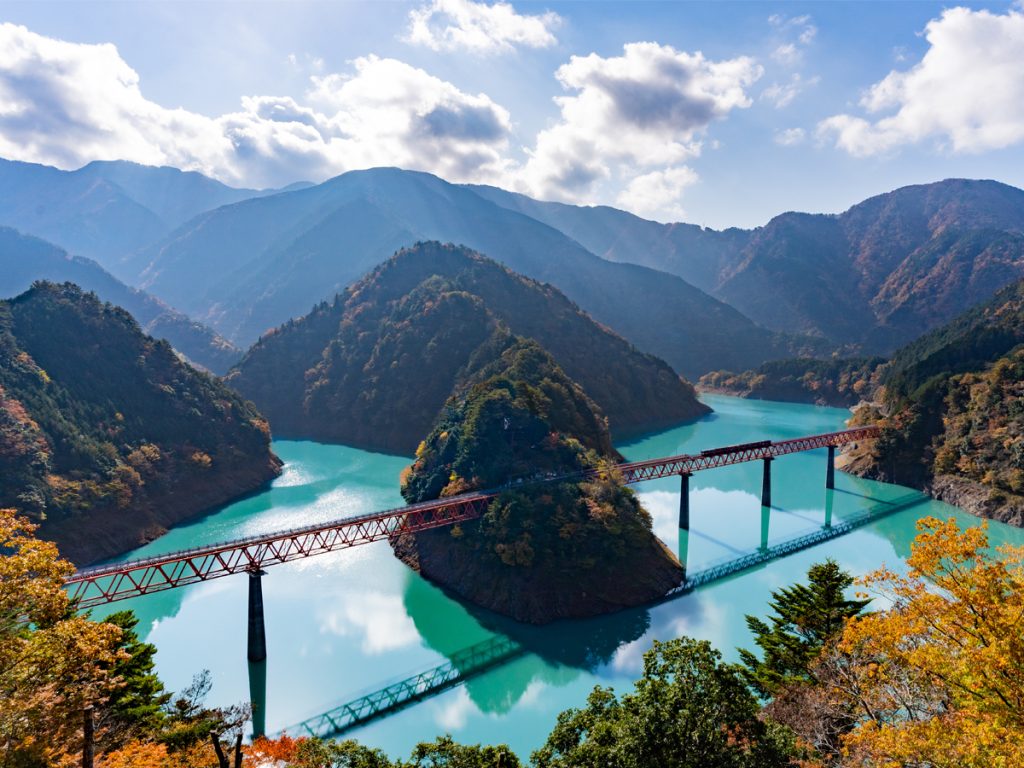 山々に囲まれた湖の真ん中に、小さな駅がぽっかり浮かんでいるような眺めの『奥大井湖上駅』。クールジャパン・アワード2019も受賞し、近年人気急上昇中のスポットです。長島ダムがある接岨湖にかかるレインボーブリッジの真ん中に、この秘境駅はあります。
